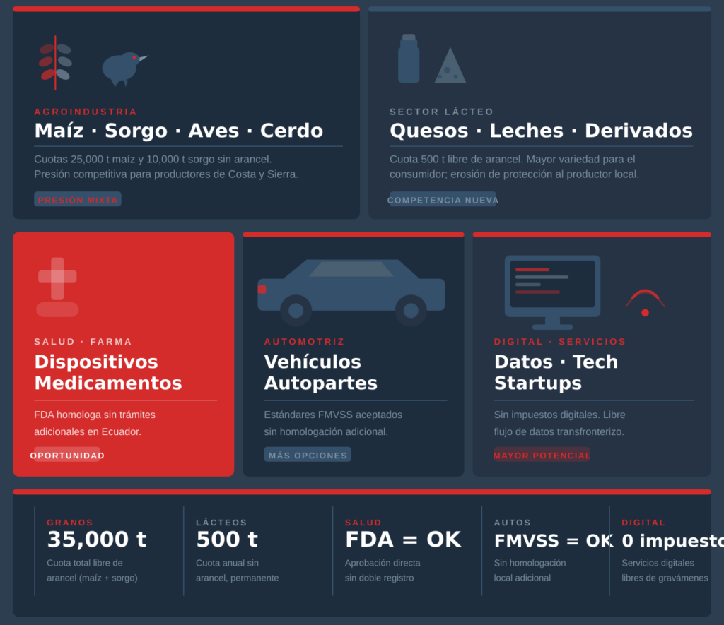 | 3 | Homologación regulatoria profunda | Ecuador deberá aceptar dispositivos médicos aprobados por la FDA, productos farmacéuticos con autorización previa de la FDA, y vehículos y autopartes que cumplan las normas FMVSS de EE.UU. —sin exigir certificaciones adicionales nacionales. |